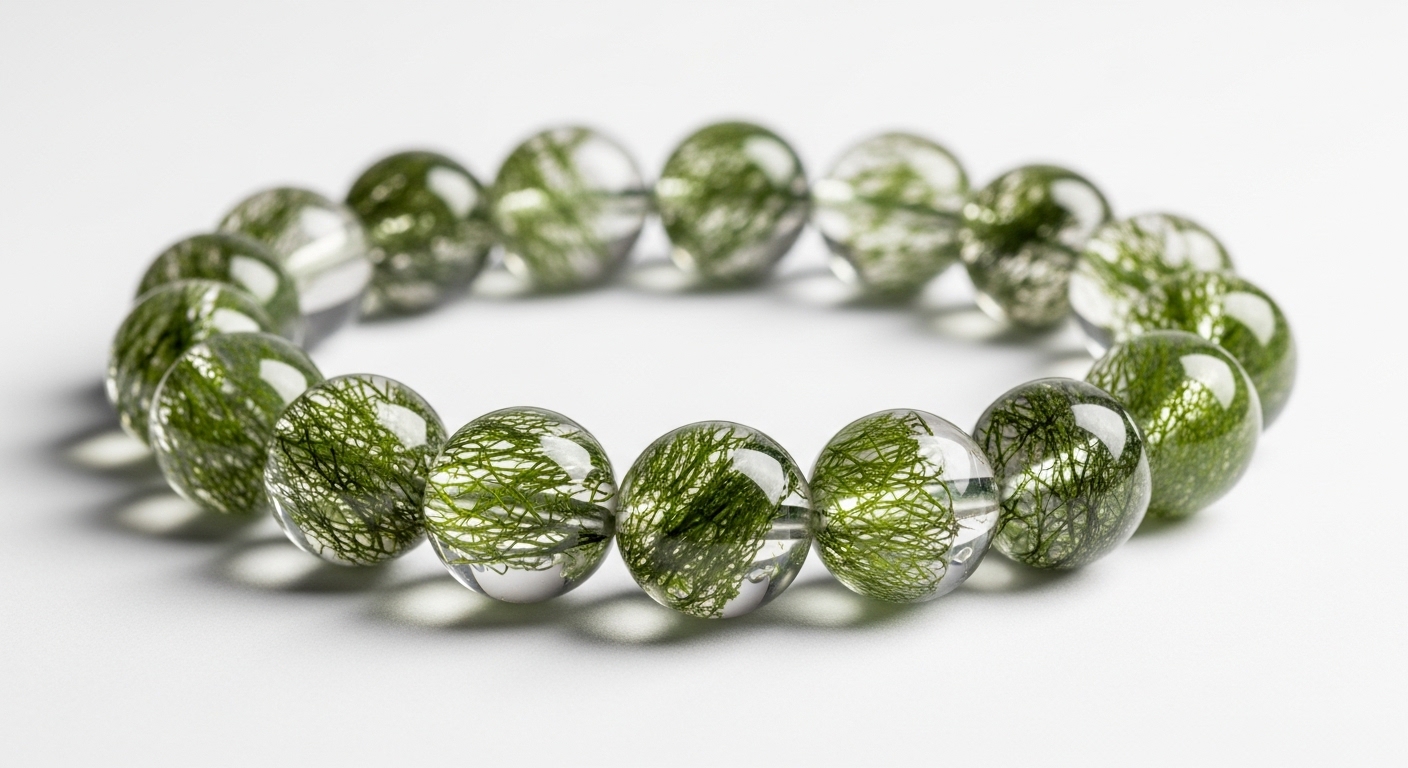 Natural Green Phantom Quartz bracelets crafted from clear quartz with unique moss-like inclusions, creating a distinctive “garden” effect. Each bead features organic green mineral formations, making every bracelet one of a kind. Polished to a high-gloss finish, these bracelets offer strong transparency combined with rich internal texture. The contrast between clear quartz and green inclusions creates a premium, earthy aesthetic that is highly appealing in retail environments. This style is especially popular among crystal shops, gift boutiques, and lifestyle stores due to its natural look and strong visual uniqueness. Each piece is unique in pattern and inclusion distribution.